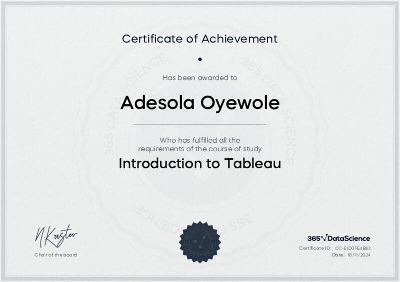 This user has been awarded the Introduction to Tableau Certificate for successfully completing the course exam. Holding this certificate demonstrates their proficiency on the topic and signifies they are qualified to apply their newly acquired expertise in the fields of data analytics and data science.