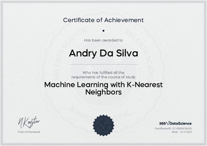 This user has been awarded the Machine Learning with K-Nearest Neighbors Certificate for successfully completing the course exam. Holding this certificate demonstrates their proficiency on the topic and signifies they are qualified to apply their newly acquired expertise in the fields of data analytics and data science.