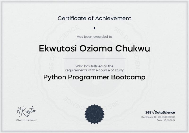 This user has been awarded the Python Programmer Bootcamp Certificate for successfully completing the course exam. Holding this certificate demonstrates their proficiency on the topic and signifies they are qualified to apply their newly acquired expertise in the fields of data analytics and data science.