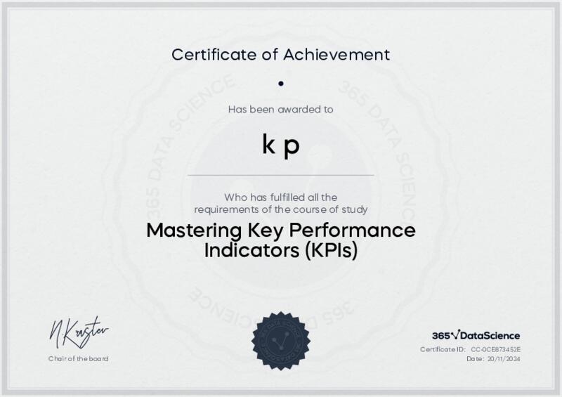 This user has been awarded the Mastering Key Performance Indicators (KPIs) Certificate for successfully completing the course exam. Holding this certificate demonstrates their proficiency on the topic and signifies they are qualified to apply their newly acquired expertise in the fields of data analytics and data science.