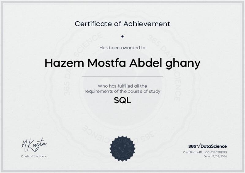 This user has been awarded the SQL Certificate for successfully completing the course exam. Holding this certificate demonstrates their proficiency on the topic and signifies they are qualified to apply their newly acquired expertise in the fields of data analytics and data science.