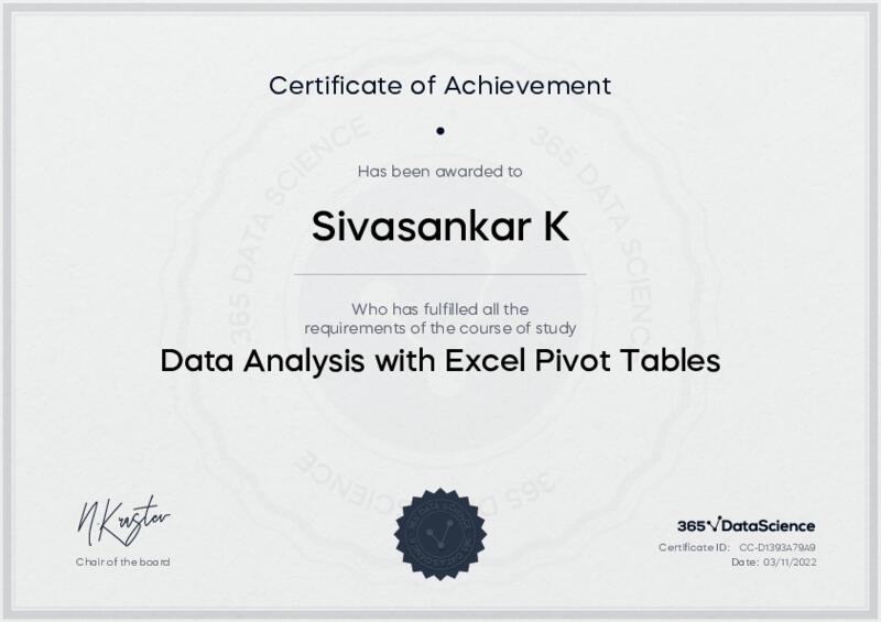 This user has been awarded the Data Analysis with Excel Pivot Tables Certificate for successfully completing the course exam. Holding this certificate demonstrates their proficiency on the topic and signifies they are qualified to apply their newly acquired expertise in the fields of data analytics and data science.