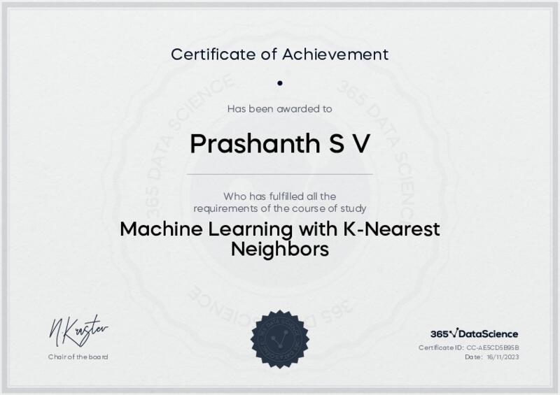 This user has been awarded the Machine Learning with K-Nearest Neighbors Certificate for successfully completing the course exam. Holding this certificate demonstrates their proficiency on the topic and signifies they are qualified to apply their newly acquired expertise in the fields of data analytics and data science.