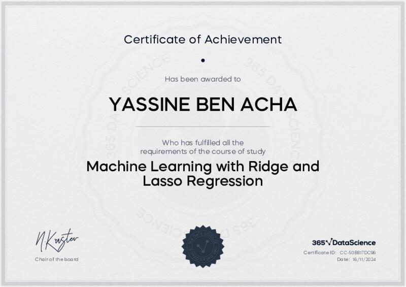 This user has been awarded the Machine Learning with Ridge and Lasso Regression Certificate for successfully completing the course exam. Holding this certificate demonstrates their proficiency on the topic and signifies they are qualified to apply their newly acquired expertise in the fields of data analytics and data science.