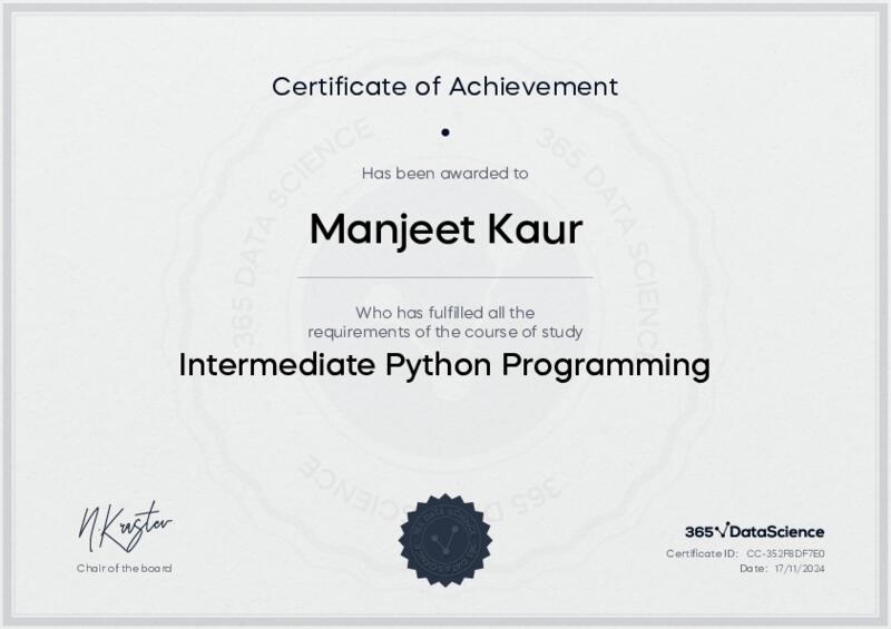 This user has been awarded the Intermediate Python Programming Certificate for successfully completing the course exam. Holding this certificate demonstrates their proficiency on the topic and signifies they are qualified to apply their newly acquired expertise in the fields of data analytics and data science.