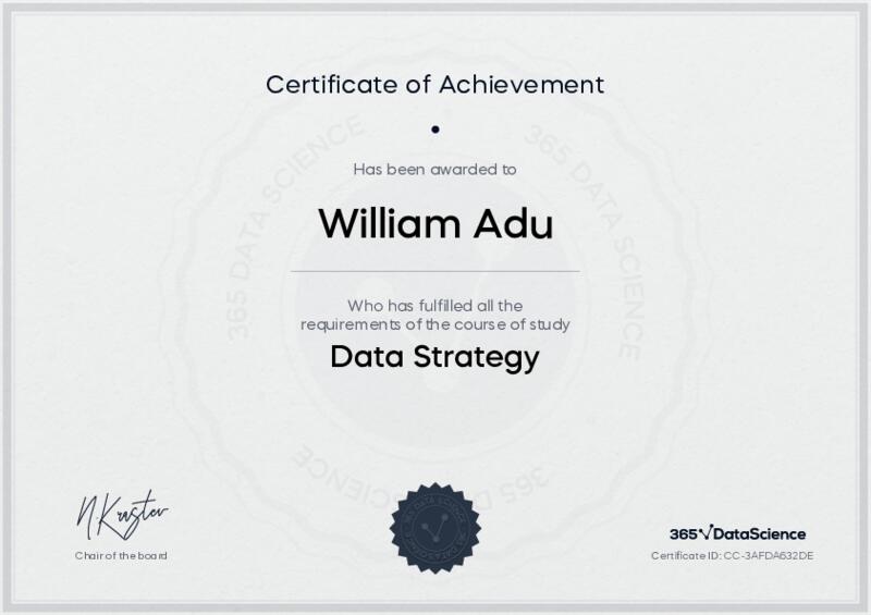 This user has been awarded the Data Strategy Certificate for successfully completing the course exam. Holding this certificate demonstrates their proficiency on the topic and signifies they are qualified to apply their newly acquired expertise in the fields of data analytics and data science.