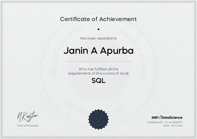 This user has been awarded the SQL Certificate for successfully completing the course exam. Holding this certificate demonstrates their proficiency on the topic and signifies they are qualified to apply their newly acquired expertise in the fields of data analytics and data science.