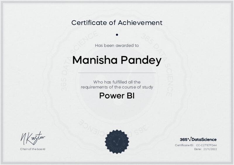 This user has been awarded the Power BI Certificate for successfully completing the course exam. Holding this certificate demonstrates their proficiency on the topic and signifies they are qualified to apply their newly acquired expertise in the fields of data analytics and data science.