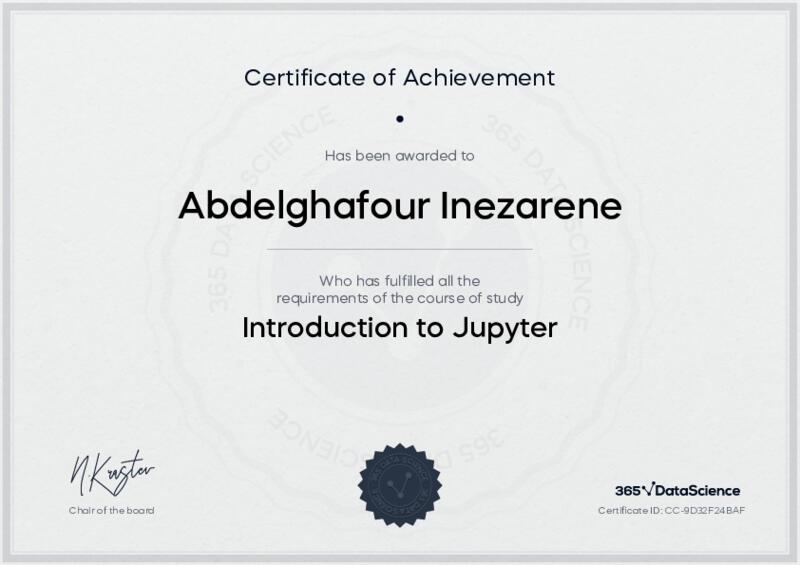 This user has been awarded the Introduction to Jupyter Certificate for successfully completing the course exam. Holding this certificate demonstrates their proficiency on the topic and signifies they are qualified to apply their newly acquired expertise in the fields of data analytics and data science.