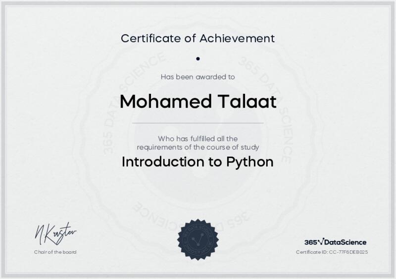 This user has been awarded the Introduction to Python Certificate for successfully completing the course exam. Holding this certificate demonstrates their proficiency on the topic and signifies they are qualified to apply their newly acquired expertise in the fields of data analytics and data science.