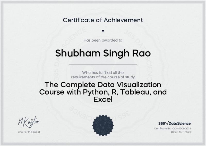 This user has been awarded the The Complete Data Visualization Course with Python, R, Tableau, and Excel Certificate for successfully completing the course exam. Holding this certificate demonstrates their proficiency on the topic and signifies they are qualified to apply their newly acquired expertise in the fields of data analytics and data science.