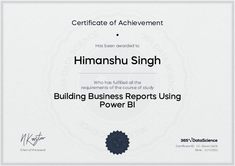 This user has been awarded the Building Business Reports Using Power BI Certificate for successfully completing the course exam. Holding this certificate demonstrates their proficiency on the topic and signifies they are qualified to apply their newly acquired expertise in the fields of data analytics and data science.
