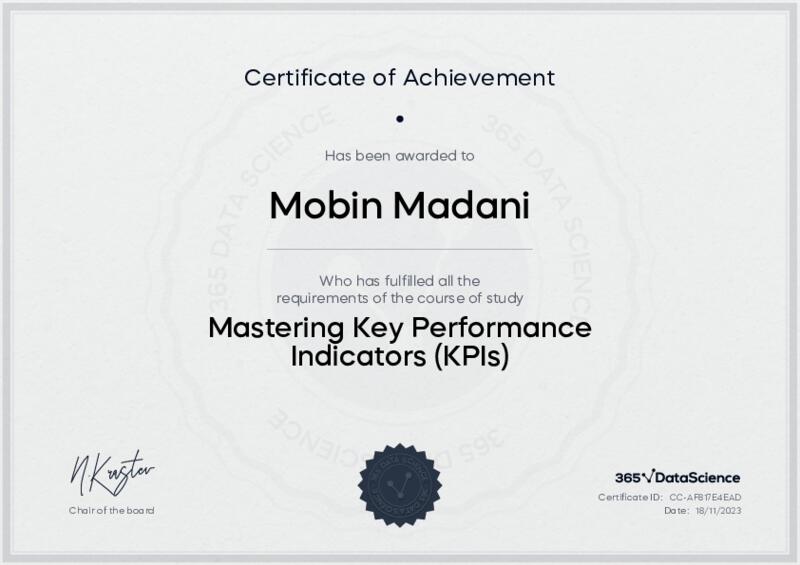 This user has been awarded the Mastering Key Performance Indicators (KPIs) Certificate for successfully completing the course exam. Holding this certificate demonstrates their proficiency on the topic and signifies they are qualified to apply their newly acquired expertise in the fields of data analytics and data science.