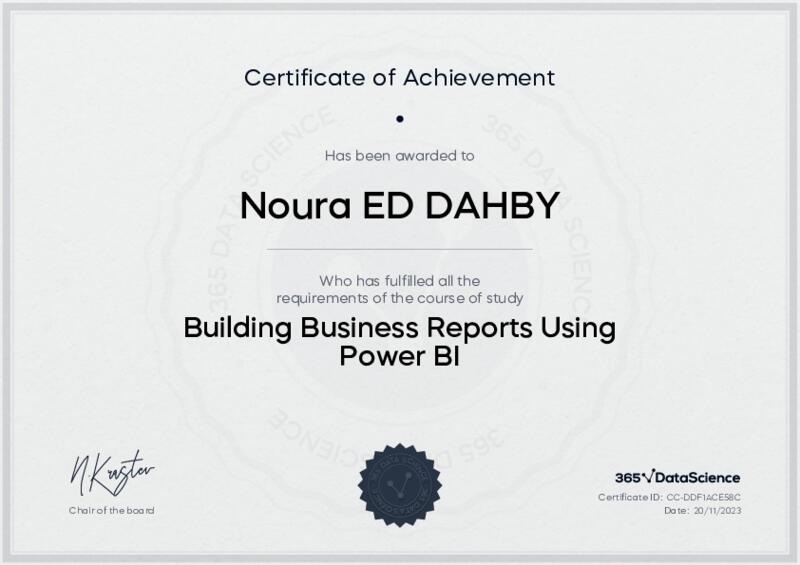 This user has been awarded the Building Business Reports Using Power BI Certificate for successfully completing the course exam. Holding this certificate demonstrates their proficiency on the topic and signifies they are qualified to apply their newly acquired expertise in the fields of data analytics and data science.