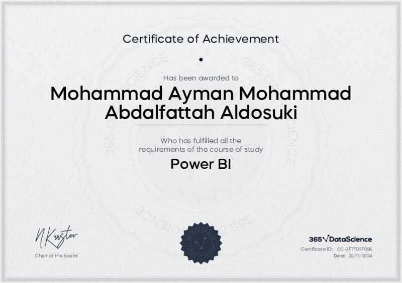 This user has been awarded the Power BI Certificate for successfully completing the course exam. Holding this certificate demonstrates their proficiency on the topic and signifies they are qualified to apply their newly acquired expertise in the fields of data analytics and data science.