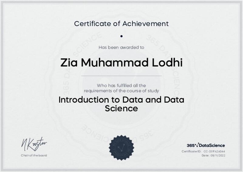 This user has been awarded the Introduction to Data and Data Science Certificate for successfully completing the course exam. Holding this certificate demonstrates their proficiency on the topic and signifies they are qualified to apply their newly acquired expertise in the fields of data analytics and data science.