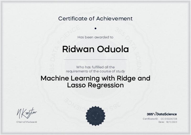 This user has been awarded the Machine Learning with Ridge and Lasso Regression Certificate for successfully completing the course exam. Holding this certificate demonstrates their proficiency on the topic and signifies they are qualified to apply their newly acquired expertise in the fields of data analytics and data science.