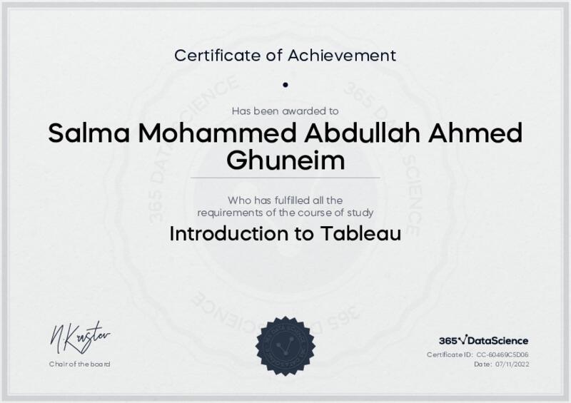 This user has been awarded the Introduction to Tableau Certificate for successfully completing the course exam. Holding this certificate demonstrates their proficiency on the topic and signifies they are qualified to apply their newly acquired expertise in the fields of data analytics and data science.