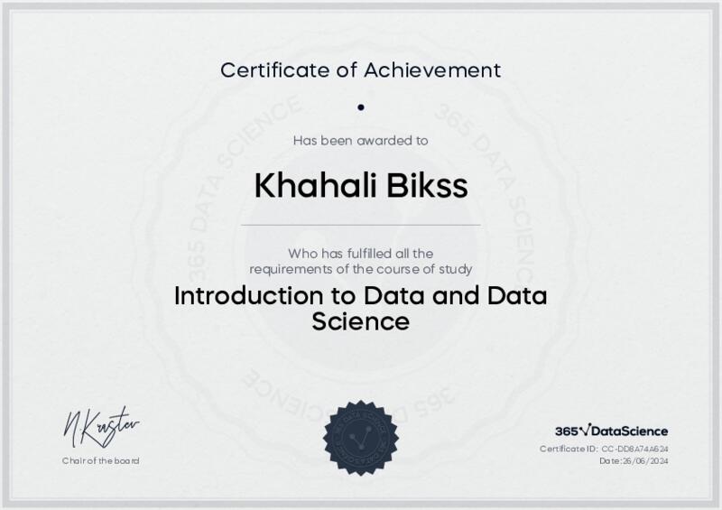 This user has been awarded the Introduction to Data and Data Science Certificate for successfully completing the course exam. Holding this certificate demonstrates their proficiency on the topic and signifies they are qualified to apply their newly acquired expertise in the fields of data analytics and data science.