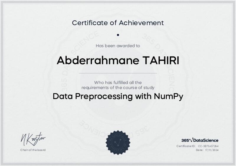 This user has been awarded the Data Preprocessing with NumPy Certificate for successfully completing the course exam. Holding this certificate demonstrates their proficiency on the topic and signifies they are qualified to apply their newly acquired expertise in the fields of data analytics and data science.