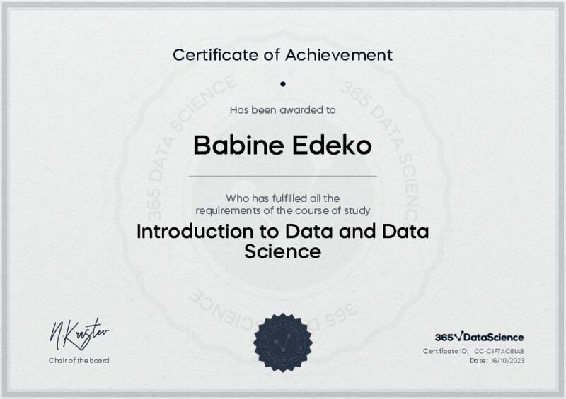 This user has been awarded the Introduction to Data and Data Science Certificate for successfully completing the course exam. Holding this certificate demonstrates their proficiency on the topic and signifies they are qualified to apply their newly acquired expertise in the fields of data analytics and data science.