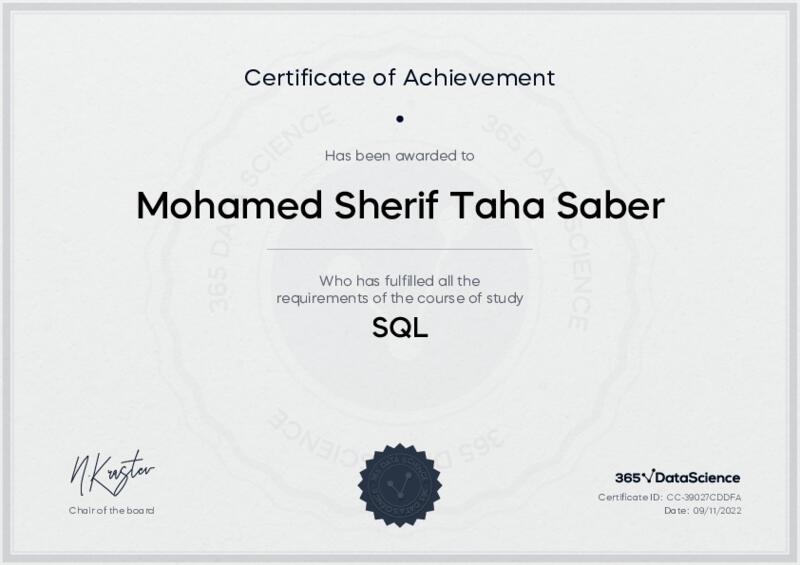 This user has been awarded the SQL Certificate for successfully completing the course exam. Holding this certificate demonstrates their proficiency on the topic and signifies they are qualified to apply their newly acquired expertise in the fields of data analytics and data science.