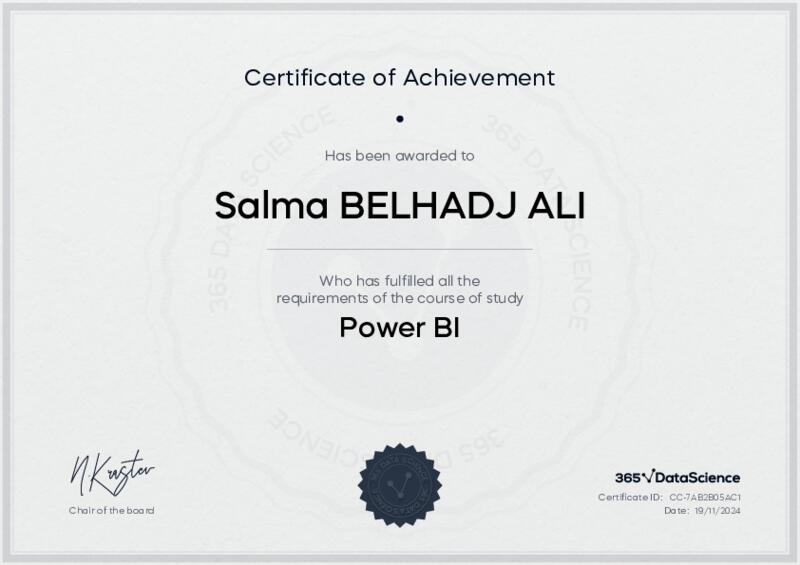 This user has been awarded the Power BI Certificate for successfully completing the course exam. Holding this certificate demonstrates their proficiency on the topic and signifies they are qualified to apply their newly acquired expertise in the fields of data analytics and data science.
