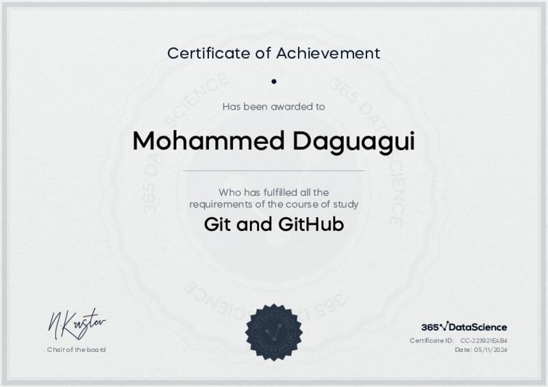 This user has been awarded the Git and GitHub Certificate for successfully completing the course exam. Holding this certificate demonstrates their proficiency on the topic and signifies they are qualified to apply their newly acquired expertise in the fields of data analytics and data science.