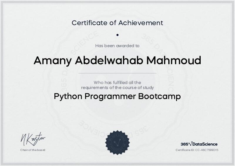 This user has been awarded the Python Programmer Bootcamp Certificate for successfully completing the course exam. Holding this certificate demonstrates their proficiency on the topic and signifies they are qualified to apply their newly acquired expertise in the fields of data analytics and data science.