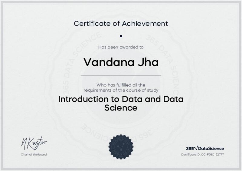 This user has been awarded the Introduction to Data and Data Science Certificate for successfully completing the course exam. Holding this certificate demonstrates their proficiency on the topic and signifies they are qualified to apply their newly acquired expertise in the fields of data analytics and data science.