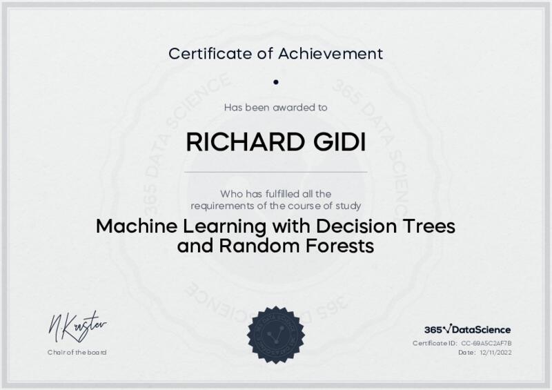 This user has been awarded the Machine Learning with Decision Trees and Random Forests Certificate for successfully completing the course exam. Holding this certificate demonstrates their proficiency on the topic and signifies they are qualified to apply their newly acquired expertise in the fields of data analytics and data science.
