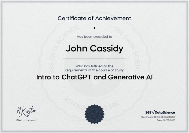 This user has been awarded the Intro to ChatGPT and Generative AI Certificate for successfully completing the course exam. Holding this certificate demonstrates their proficiency on the topic and signifies they are qualified to apply their newly acquired expertise in the fields of data analytics and data science.