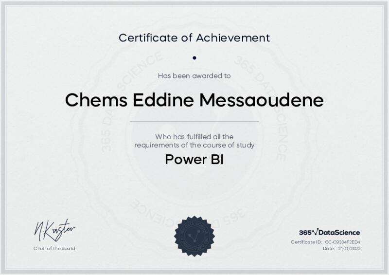 This user has been awarded the Power BI Certificate for successfully completing the course exam. Holding this certificate demonstrates their proficiency on the topic and signifies they are qualified to apply their newly acquired expertise in the fields of data analytics and data science.