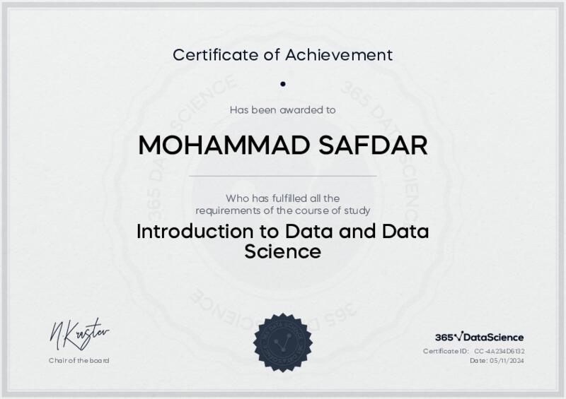 This user has been awarded the Introduction to Data and Data Science Certificate for successfully completing the course exam. Holding this certificate demonstrates their proficiency on the topic and signifies they are qualified to apply their newly acquired expertise in the fields of data analytics and data science.