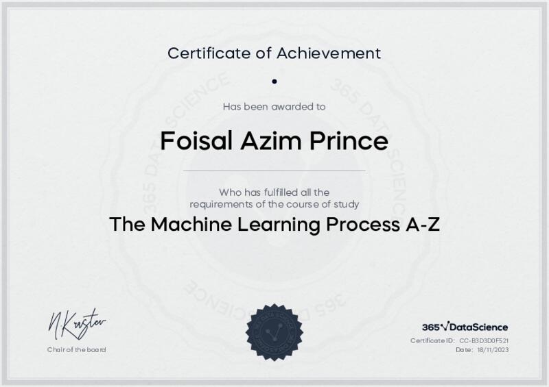 This user has been awarded the The Machine Learning Process A-Z Certificate for successfully completing the course exam. Holding this certificate demonstrates their proficiency on the topic and signifies they are qualified to apply their newly acquired expertise in the fields of data analytics and data science.