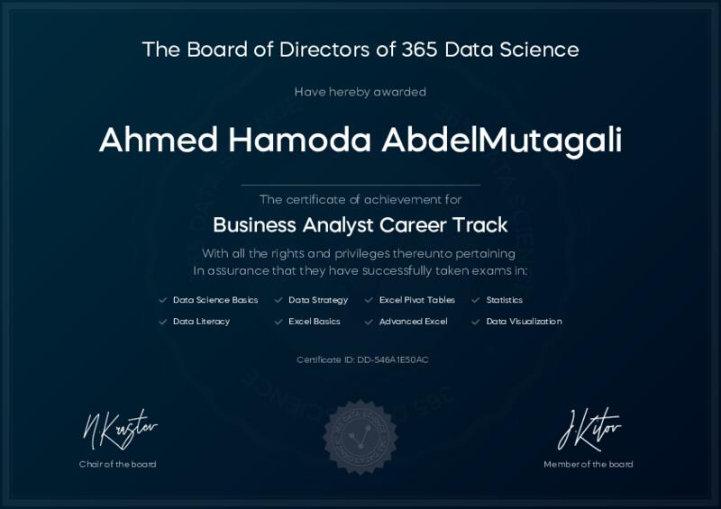 This user has been awarded the Business Analyst Career Track Certificate for successfully completing all courses and assessments. This certificate confirms their technical expertise and professional credibility to work as a business analyst.