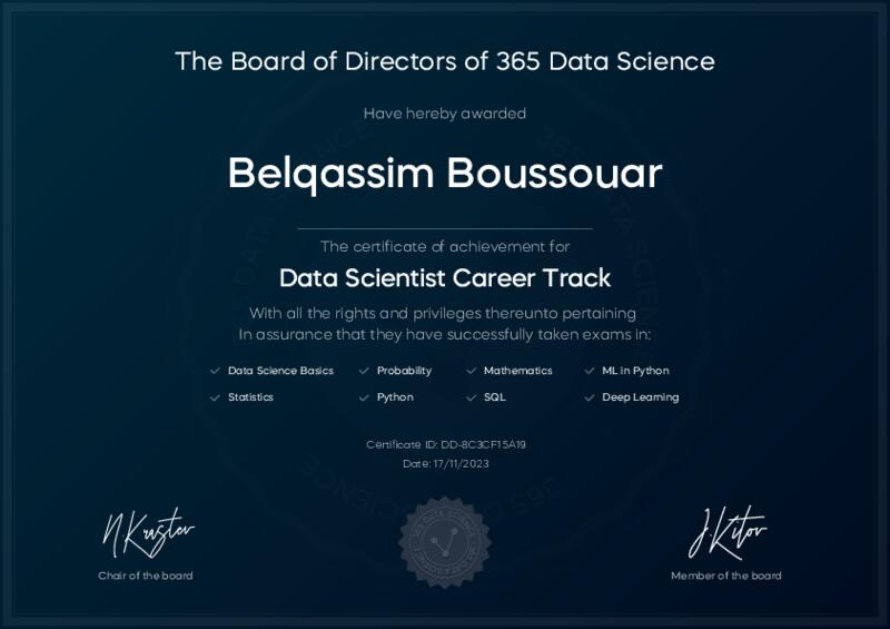 This user has been awarded the Data Scientist Career Track Certificate for successfully completing all courses and assessments. This certificate confirms their technical expertise and professional credibility to work as a data scientist.