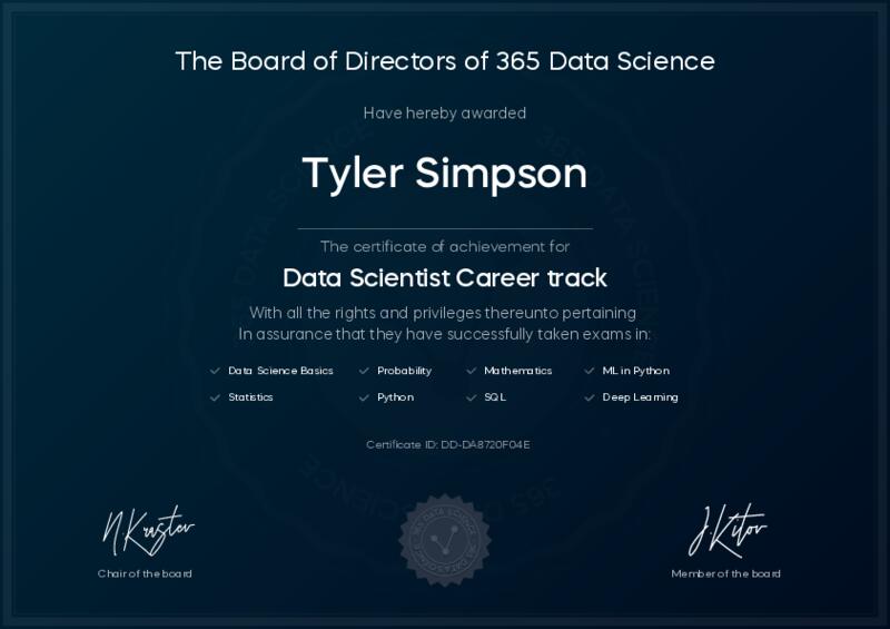 This user has been awarded the Data Scientist Career Track Certificate for successfully completing all courses and assessments. This certificate confirms their technical expertise and professional credibility to work as a data scientist.
