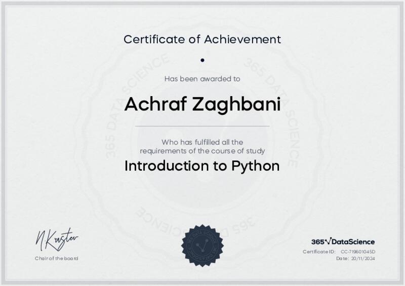 This user has been awarded the Introduction to Python Certificate for successfully completing the course exam. Holding this certificate demonstrates their proficiency on the topic and signifies they are qualified to apply their newly acquired expertise in the fields of data analytics and data science.