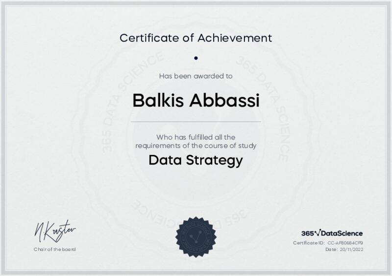 This user has been awarded the Data Strategy Certificate for successfully completing the course exam. Holding this certificate demonstrates their proficiency on the topic and signifies they are qualified to apply their newly acquired expertise in the fields of data analytics and data science.