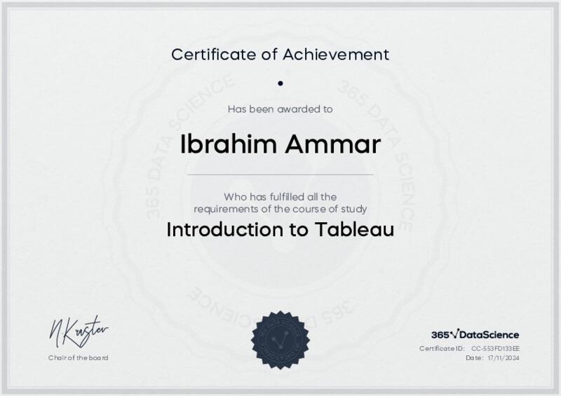 This user has been awarded the Introduction to Tableau Certificate for successfully completing the course exam. Holding this certificate demonstrates their proficiency on the topic and signifies they are qualified to apply their newly acquired expertise in the fields of data analytics and data science.