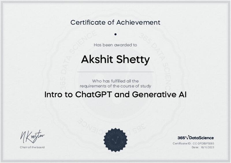 This user has been awarded the Intro to ChatGPT and Generative AI Certificate for successfully completing the course exam. Holding this certificate demonstrates their proficiency on the topic and signifies they are qualified to apply their newly acquired expertise in the fields of data analytics and data science.