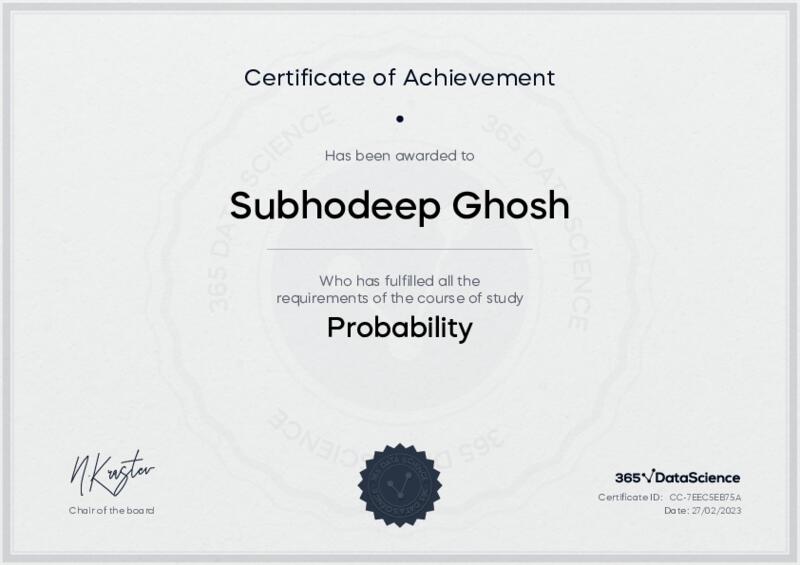This user has been awarded the Probability Certificate for successfully completing the course exam. Holding this certificate demonstrates their proficiency on the topic and signifies they are qualified to apply their newly acquired expertise in the fields of data analytics and data science.