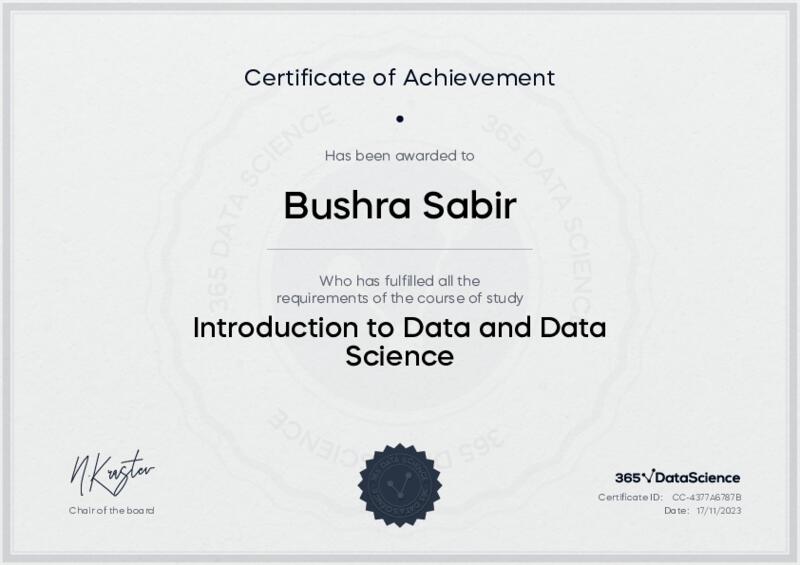 This user has been awarded the Introduction to Data and Data Science Certificate for successfully completing the course exam. Holding this certificate demonstrates their proficiency on the topic and signifies they are qualified to apply their newly acquired expertise in the fields of data analytics and data science.