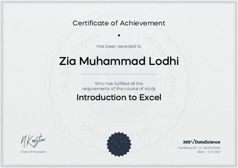 This user has been awarded the Introduction to Excel Certificate for successfully completing the course exam. Holding this certificate demonstrates their proficiency on the topic and signifies they are qualified to apply their newly acquired expertise in the fields of data analytics and data science.
