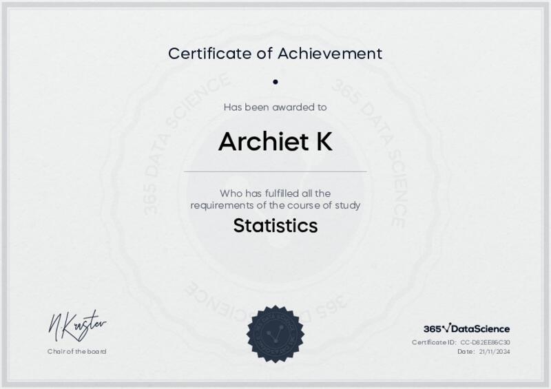 This user has been awarded the Statistics Certificate for successfully completing the course exam. Holding this certificate demonstrates their proficiency on the topic and signifies they are qualified to apply their newly acquired expertise in the fields of data analytics and data science.