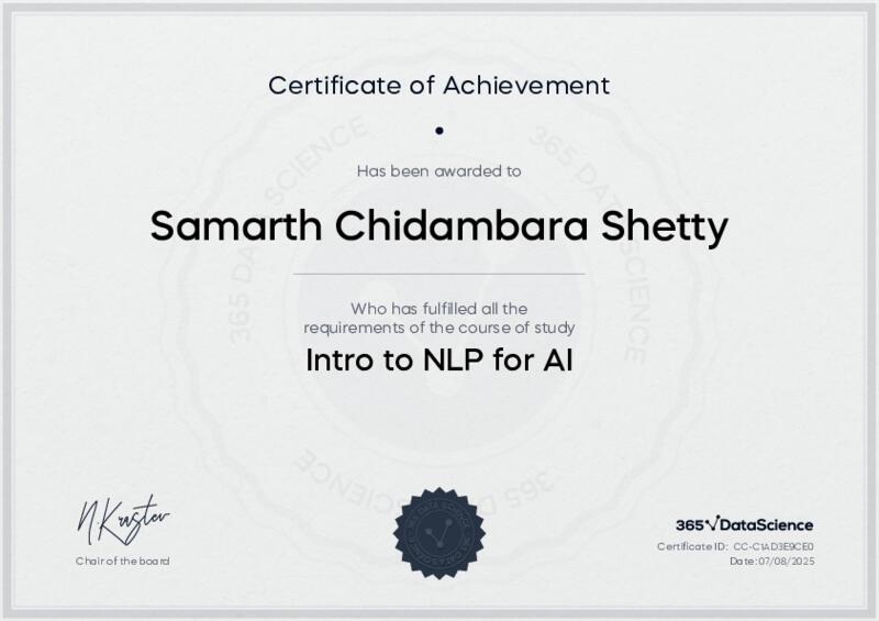 This user has been awarded the Intro to NLP for AI Certificate for successfully completing the course exam. Holding this certificate demonstrates their proficiency on the topic and signifies they are qualified to apply their newly acquired expertise in the fields of data analytics and data science.