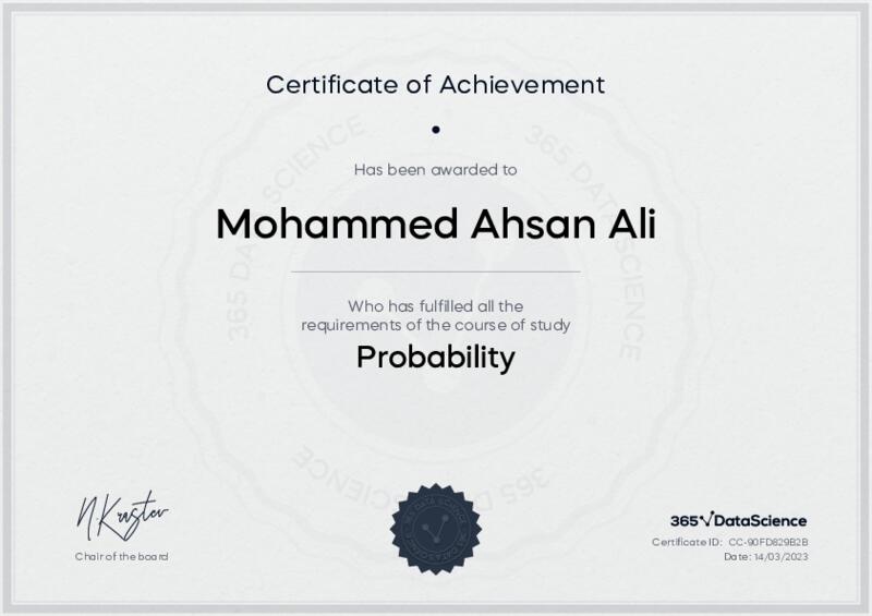 This user has been awarded the Probability Certificate for successfully completing the course exam. Holding this certificate demonstrates their proficiency on the topic and signifies they are qualified to apply their newly acquired expertise in the fields of data analytics and data science.