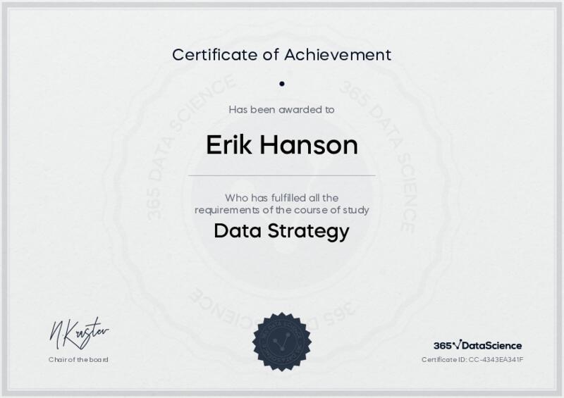 This user has been awarded the Data Strategy Certificate for successfully completing the course exam. Holding this certificate demonstrates their proficiency on the topic and signifies they are qualified to apply their newly acquired expertise in the fields of data analytics and data science.
