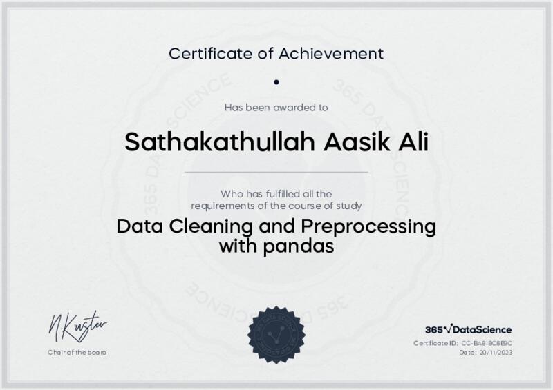 This user has been awarded the Data Cleaning and Preprocessing with pandas Certificate for successfully completing the course exam. Holding this certificate demonstrates their proficiency on the topic and signifies they are qualified to apply their newly acquired expertise in the fields of data analytics and data science.